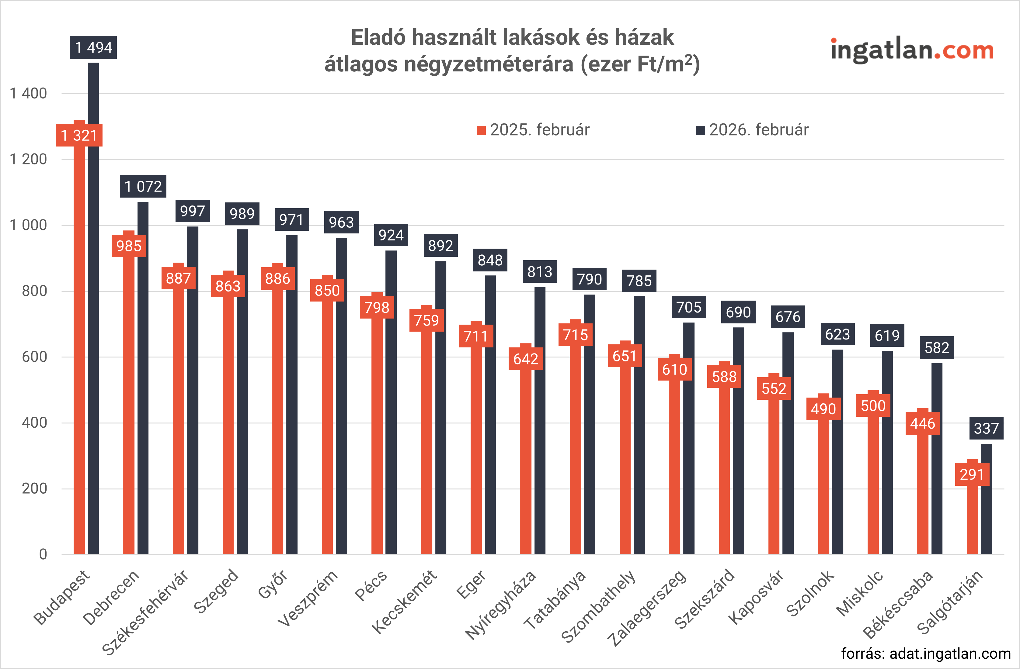 Debrecenben majdnem 1700 eladó használt lakóingatlan szerepel a kínálatban, itt az árak már elérik az 1,07 millió forintot. Szeged és Győr fej-fej mellett halad: előbbi városban 1574 használt lakás keresi gazdáját 989 ezer forintos, utóbbiban 1190 ingatlan 971 ezer forintos négyzetméteráron. Székesfehérváron 588 használt eladó lakás mellett 997 ezer forintos árszint az irányadó, míg Kecskeméten 670 használt ingatlan érhető el 892 ezer forintos medián négyzetméteráron. Miskolcon a több mint 1000 darabos használtlakás-kínálathoz mellett 619 ezer forintos érték társult. A legolcsóbb vármegyeszékhely továbbra is Salgótarján négyzetméterenként átlagosan 339 ezer forinttal, ami a legdrágábbnak számító debreceni lakásárszint kevesebb mint harmadát teszi ki.